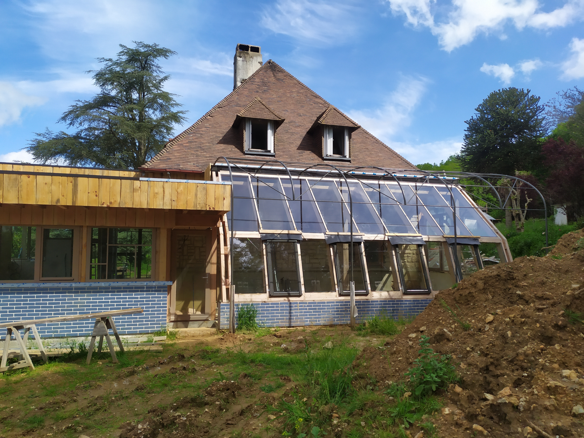 La serre a été autoconstruite par le Maître d’Ouvrage en façade Sud en vu de cultiver des fruits et légumes toute l’année.