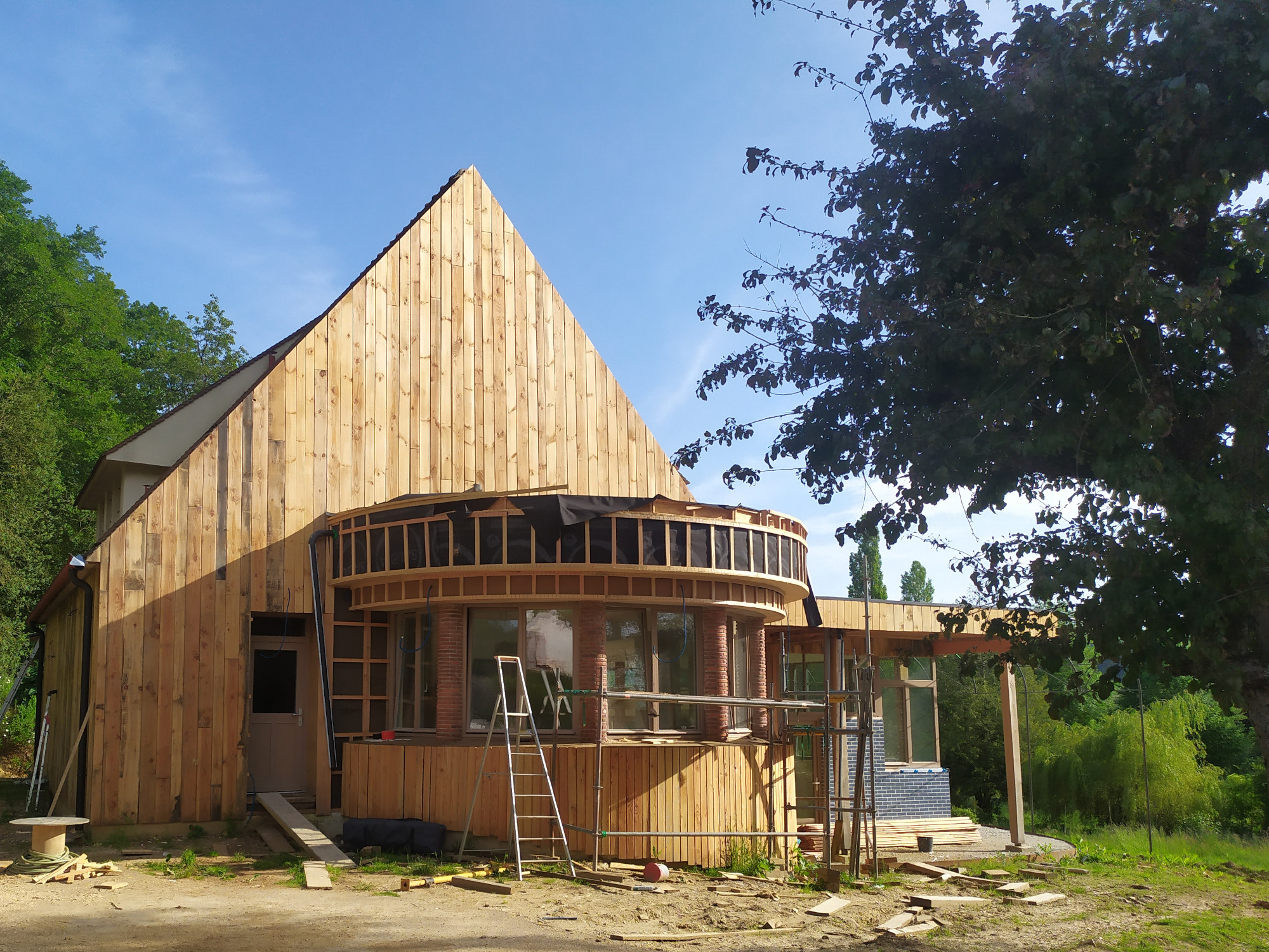 L’ossature bois de l’extension ainsi que les bardages de l’ensemble ont été réalisés avec des chênes, douglas et sapins coupé sur la parcelle et scié sur place. Des menuiseries bois triple vitrage ont été installée. Les enduits intérieurs sont en terre crue.