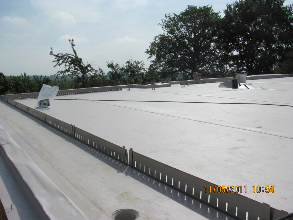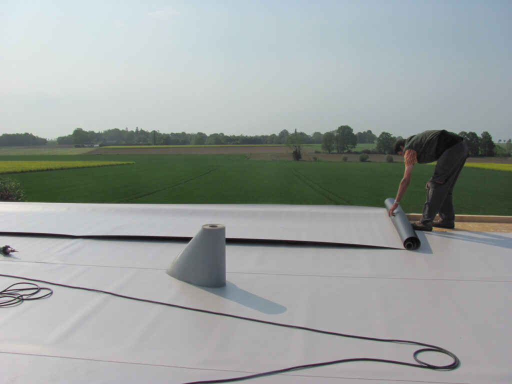 constituée d’une étanchéité EPDM et d’une protection avec un couvert végétal rustique à base de Sédums. Ce principe de toiture conduit à une architecture plutôt basse et