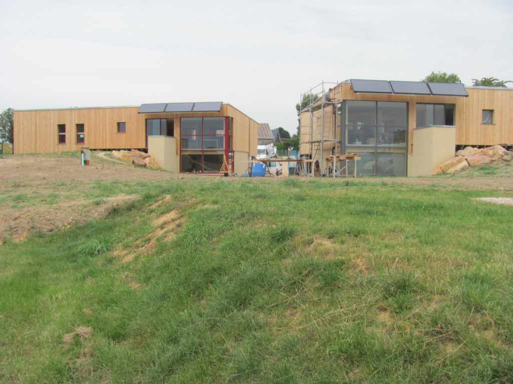 enterré avec un abri ouvert pour automobile, un garage à vélo formant aussi local technique et une salle de jeu. Les pièces principales et les chambres sont organisées de pain pied au niveau supérieur.