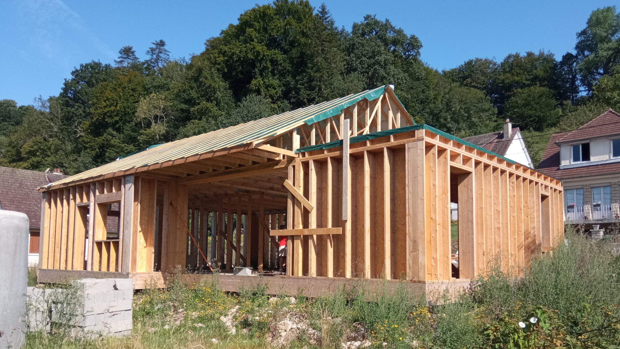 La couverture prend la forme d’une toiture à double pans en bac acier à joint debout sur la partie principale de la maison et le volume de la maison à l’Est est couvert par une toiture terrasse végétalisable. Le pan Sud du volume principal de la toiture accueille des panneaux photovoltaïques et des capteurs solaires. Une serre est accolée à la façade Sud de la maison, dans le prolongement de la toiture.