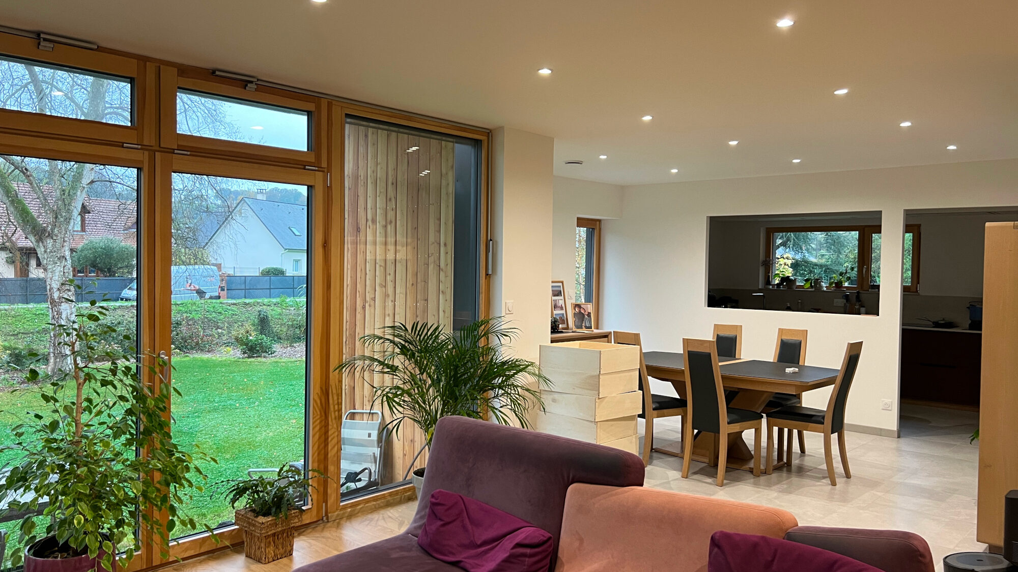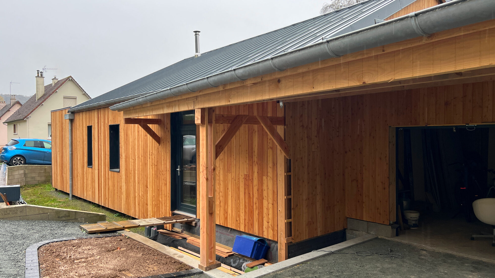L’ossature bois isolée en paille est habillée d’un bardage en bois naturel vertical. Des menuiseries triple vitrage mixtes bois et alu de couleur gris anthracite ont été installées.